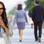 Portrait of gorgeous caucasian woman in stylish elegant clothes and make up looking away with crossed arms against kissing couple in the street. Cheating concept. Third wheel.